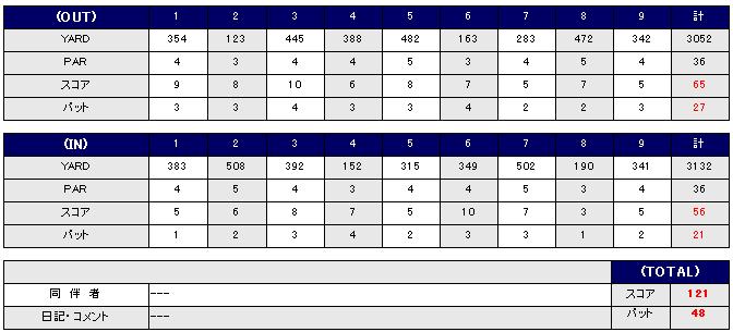 またもや吉野カントリーに行ってきました。平日だとお昼ご飯食べて、ビールを飲んでも8500円ぐらで収まるのでとってもリーズナブルです。部長にメールで116でしたと、報告したんですが、計算間違いで121でした。GDOに入力してる時に初めて気付いた。やっと110台にのったと思ったのに。恥ずかしいやら、悔しいやらこの憤懣をどうしていいかわからない心境です。うーん。まだまだ甘いですな。コンペだと、こりゃ失格もんです。