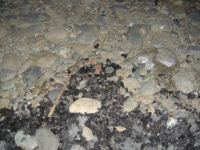 前方に黒い物体が!これは…、炭や…。炭見っけたー!夏にバーべキュウして、その残骸が残っとったんや!細かく砕けてるけどこいつは使える!