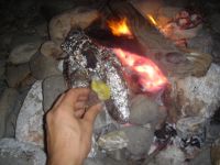 とにかく適当なところに囲炉裏を作ろう。半分埋まってる大きな石をゴロリと。その窪みを囲むように石を積み重ねて囲炉裏完成。新聞紙に水を染み込ませて、芋に巻き、その上からアルミホイルで包む。この濡れた新聞紙作戦はママンから教わったよ。よし、素材は準備OK。しかし、新聞紙とビグザムだけだし燃料が心細い。薪を探さないと。ということで薪を探しにレッツゴー。