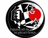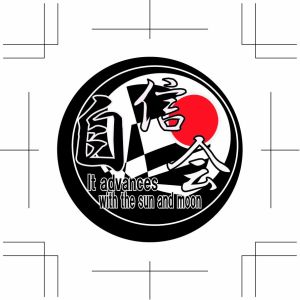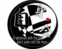 裁断に問題があるようで、多少のばらつきがあるようです。それも考慮して、中心の白い円を斜め上に配置することで、上手くごまかせるようにしてます(逆にミスってると誤解されやすいかな?)。あと、文字が切れる可能性があったのでIt advances with the sun,and it walks with the moon.からIt advances with the sun and moonに変更しました。意味は私的に『日進月歩』だと拡大解釈してます。