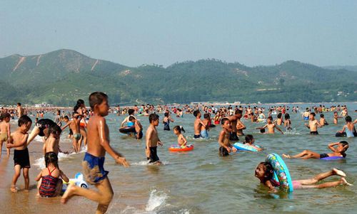 北朝鮮の児童が8月、咸境南道咸興市(ハムキョンブクド・ハムフンシ)の麻田(マジョン)海水浴場で水遊びを楽しんでいる。 中央日報(聯合ニュース)